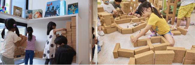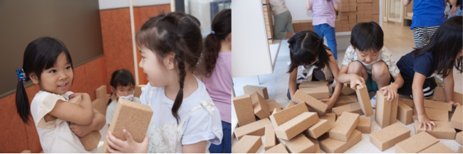コルクは天然素材で、断熱・遮音・防水・弾力・軽量・絶縁性など多くの機能特性があります。安全性が重要視される保育現場におきましては、「軽くて丈夫、かつ安全に遊べる」玩具として需要を見込みこの度導入していただきました。たった一つの長方形のカタチが子どもたちの想像力をかきたて、また従来の積み木の倍以上の大きさにも関わらず軽さを兼ね備えているため、何個も持ち運び大きな基地が出来上がるなど、保育現場では、個々から集団あそびにも繋がる様子が伺えます。