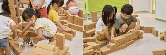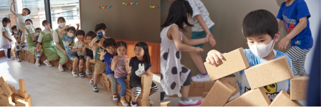 「保育園としてSDGsで何ができるのかなと考えたときに、廃棄されるコルクが再生された積み木を永続的に使っていくという着眼点において、当社の取り組みと合致していると感じます。自然を感じるナチュラルな色だからこそ、子どもが自由に色まで想像して作っています。従来の積み木より大きいため、大胆な発想に広がり、今まで思いもつかなかった遊びに繋がっていますね。角がなく安全なので、保育者としては安心な要素の一つです。発見が多くて、私たちとしても刺激を受けることが多く楽しいです」