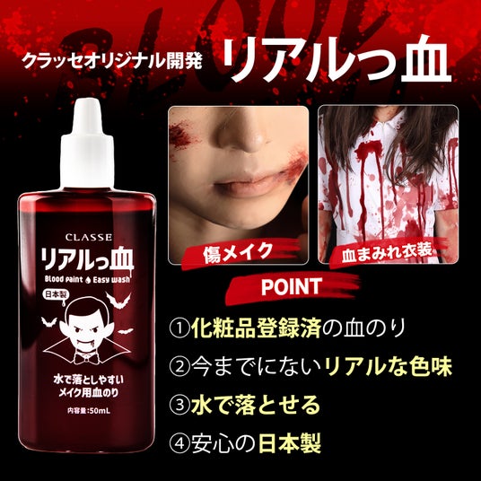 ”コスプレ総合専門店”としてウィッグやカラコン、コスメ、衣装などを広く手掛ける株式会社クラッセ(https://classe.jp / 兵庫県姫路市)は、『乾かしてはがせる肌用血のり ぺりっ血』を発売いたしました。