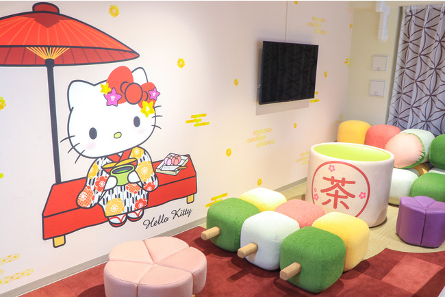 お団子をモチーフにした特注ソファや“映える”丸窓から見える和装のハローキティなど、京都らしさを取り込みつつハローキティの可愛いらしさを天井や壁など細部にまでこだわり、表現しています。