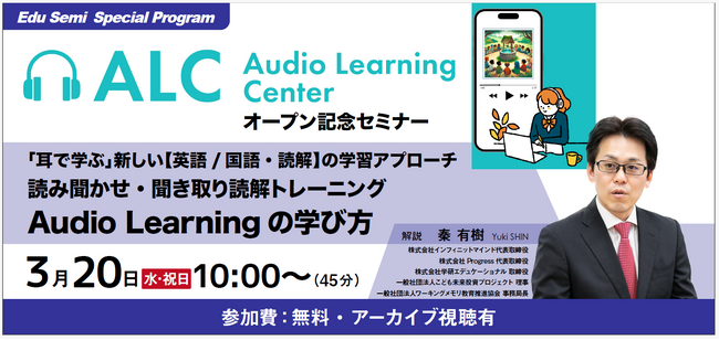 3月20日(水・祝)に「耳で学ぶ」新しい【英語/国語・読解】の学習アプローチ 読み聞かせ・聞き取り読解トレーニングAudio Learningの学び方」と題して「Audio Learning Center」の開発にかかわった同社代表取締役の秦によるオンラインセミナーを開催します。