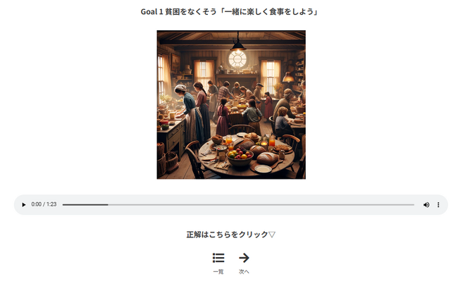 「ショートストーリー編(全17話)とストーリー編(全17話)があり、「Audio Learning Center」ウェブサイトに公開しているサンプル音源を参考に、利用者はトレーニング音声を購入できます。各ストーリーはSDGs等をテーマに、仲間と助け合い、より良い社会を実現することを学ぶ内容です。ストーリーを音声で聞き、続いて再生される内容に関する質問に口頭で答えるというトレーニングです。