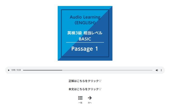 英検5級・4級・3級・準2級・2級の各レベル相当のトレーニングを提供しています。利用者は自分に合うレベルのトレーニングを購入できます。なお、各レベルには20のストーリーと質問が収録されています。「国語・読解トレーニング」と同様に「Audio Learning Center」ウェブサイトに公開しているサンプル音源を参考に、利用者はトレーニング音声を購入できます。ストーリーを音声で聞き、続いて再生される内容に関する質問に口頭で答えるというトレーニングです。なお、英語トレーニングにはディクテーションシートも別売りで用意しています。