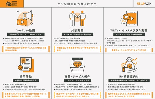 株式会社タレントリスト(所在地:東京都新宿区、代表取締役:山中もとお)は、BtoB企業向けに最適化された動画制作パッケージ「俺の動画」を正式リリースいたします。映像コンテンツによるプロモーションの需要が急速に高まる中、戦略性・クオリティ・スピードの三拍子が揃ったサービスで、企業の“伝える力”を圧倒的に強化します。
