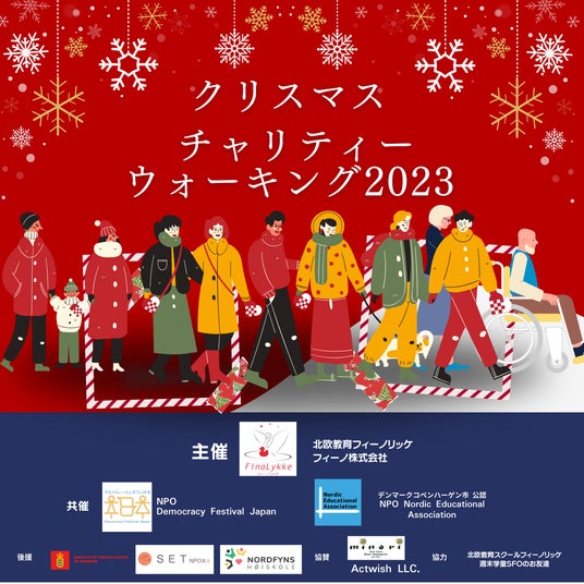 北欧教育フィーノリッケ(フィーノ株式会社、本社:東京都渋谷区、代表取締役:鈴木孝枝、学校長:山縣茜、以下フィーノリッケ)は、NPO デモクラシーフェスティバルジャパン、デンマークコペンハーゲン市認定NPONoridic Educational Associationを共催に日本で困難な環境にある子どもたちに向けてクリスマスチャリティーウォーキングを、2023年より毎年継続開催いたします。