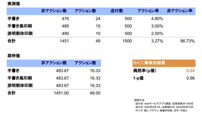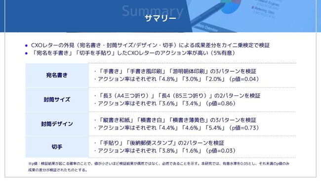 p値は0.04であり、5%有意水準において宛名を手書きしたCXOレターの有効性が検証された