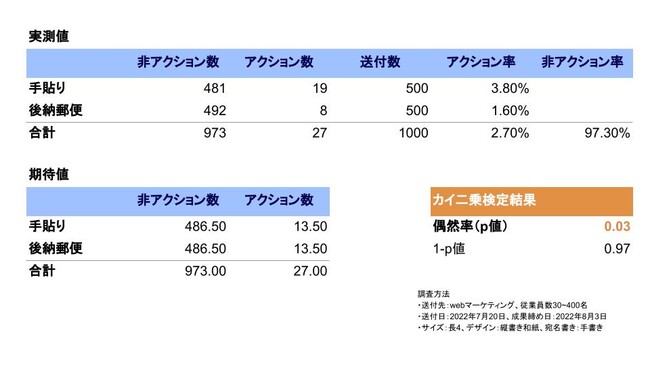 p値は0.03であり、5%有意水準において切手を手貼りしたCXOレターの有効性が検証された