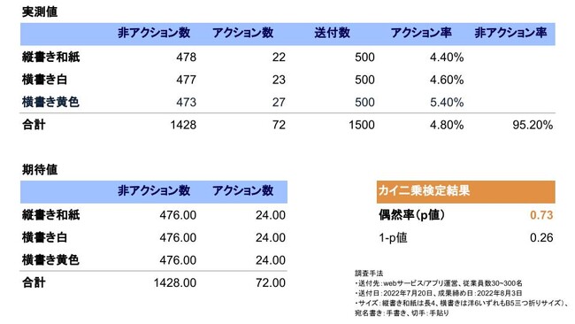 p値は0.73であり、封筒デザインによるによる有効性は検証されなかった
