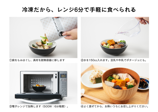 冷凍食品のため、食べるときは耐熱容器に移し、水を150cc加え、電子レンジで温めるだけ。いつでも簡単に食べられます。