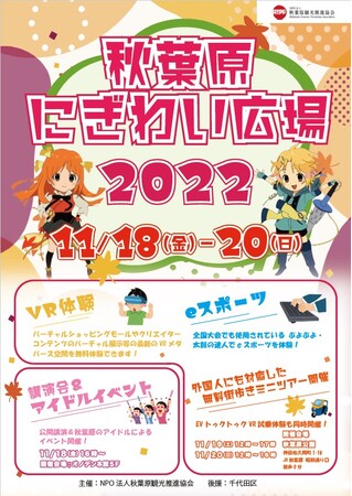 特定非営利活動法人秋葉原観光推進協会(理事長 泉 登美雄 以下:ATPA)は、公園や道路活用拡大の取組みとして、この度「秋葉原にぎわい広場2022」(以下:にぎわい広場)を11月18日(金)~11月20日(日)にエンタスと秋葉原公園で開催します。