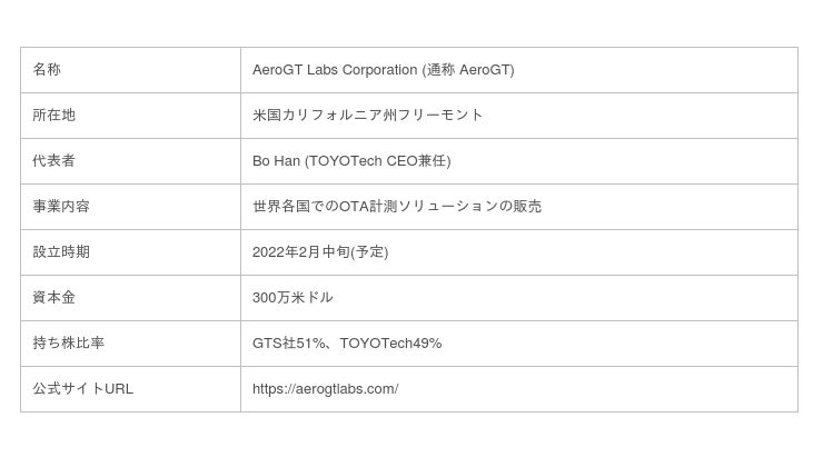 株式会社東陽テクニカ(本社:東京都中央区、代表取締役社長:高野 俊也(こうの としや)、以下 東陽テクニカ)は、東陽テクニカ米国子会社のTOYOTech LLC(本社:米国カリフォルニア州、以下 TOYOTech)が、携帯端末・アンテナおよびOTA試験※1の分野で業界トップの専門技術集団General Test Systems Inc.(本社︓中国広東省深セン市、以下 GTS社)と合同出資をし、新会社「AeroGT Labs Corporation(以下 AeroGT)」を設立することをお知らせいたします。「AeroGT(エアロジーティー)」の株式保有率は、GTS社が51%、TOYOTech(トーヨーテック)が49%となります。新会社設立は2月中旬頃の予定です。
