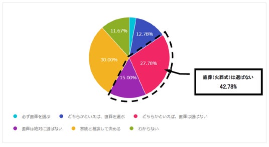 反対に、「絶対に直葬(火葬式)を選ばない」「どちらかといえば直葬(火葬式)は選ばない」人の合計は42.78%でした。