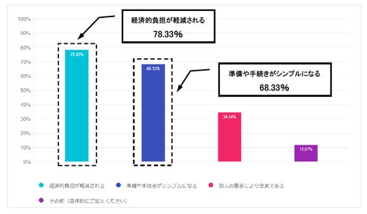 「直葬(火葬式)のメリットは?」の回答を見ると、「経済的な負担が軽減される」「準備や手続きがシンプルになる」ことが直葬(火葬式)のメリットと考える方も多く、お葬式は費用がかかるもの、手続きが煩雑なものだと捉えられている方が直葬(火葬式)を検討される傾向が強いことがわかります。
