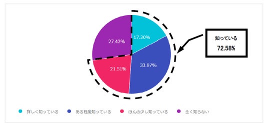 通夜や告別式を行わない「直葬」もしくは「火葬式」という葬儀の形態を知っている人は、「詳しく知っている」「ある程度知っている」「ほんの少し知っている」を合わせて72.58%で、まったく知らないと回答した割合は、27.42%でした。
