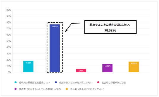 ・他人の葬儀は「直葬(火葬式)」でも抵抗はなく、人それぞれの考えがあってよいという傾向だが、親族や大切な方、自分自身の葬儀では、直葬(火葬式)以外の葬儀形態を選ぶ割合が多い。その理由のトップは、76.62%で「親族や友人との絆を大切にしたい」から。