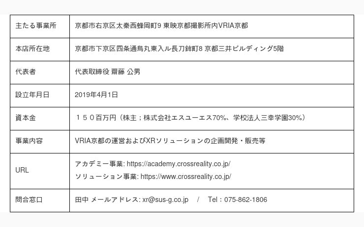 京都府の太秦メディアパーク構想の一環として、京都府のバックアップのもと、XR分野の世界的リーダーである米国企業と技術提携し、東映京都撮影所内にVRIA京都を設立。教育機関や企業のDX、リスキリング、人手不足や次世代育成への貢献をビジョンに掲げたアカデミー事業を中心に、技術力・開発力を活かしたソリューション事業や産学公連携の共同研究開発等も行っています。