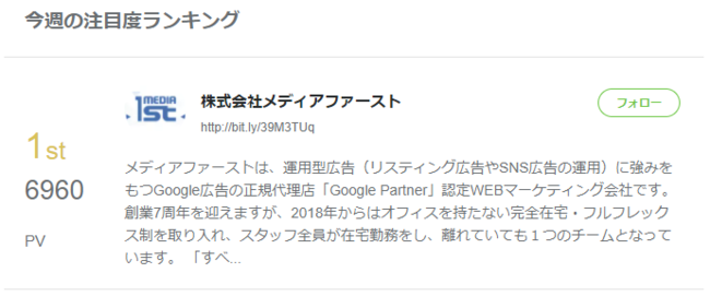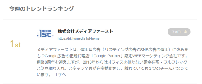 運用型広告(リスティング広告やSNS広告の運用)に強みをもつ株式会社メディアファースト(住所:東京都中央区 代表取締役:山田友彦)は、国内最大のビジネスSNS「Wantedly」(提供:ウォンテッドリー株式会社) にて、2022年9月7日時点でのトレンドランキング1位(38,742社中)にランクインしたことをお知らせいたします。