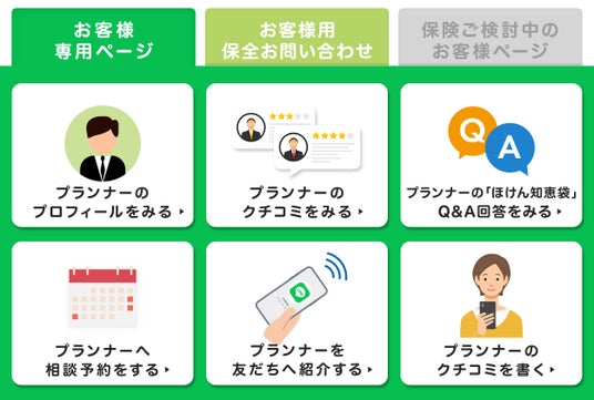 - リッチメニュー機能:「ほけん知恵袋」掲載情報と連携し、プロフィール、クチコミ、過去Q&A回答、相談予約カレンダーなどを顧客に提供します。LINEの拡散性を利用した強力な紹介ツールを装備し、また顧客のクチコミも以前より集めやすくなりました。