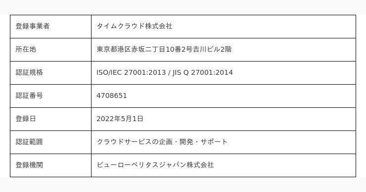 時間管理ツール「TimeCrowd」を提供するタイムクラウド株式会社(以下、タイムクラウド)は、ISMS(情報セキュリティマネジメントシステム)認証基準の国際規格「ISO/IEC27001:2013」および国内規格「JIS Q 27001:2014」の認証を、2022年5月1日付で取得しましたのでお知らせいたします。