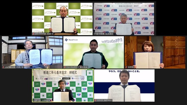 株式会社カクイチ、小諸市、独立行政法人都市再生機構(以下「UR都市機構」)、株式会社まちづくり小諸、ニューラルポケット株式会社及び一般社団法人こもろ観光局の6者は、長野県立会の下、令和4年2月3日(木)にDX社会実験の実施に関する協定を締結しました。