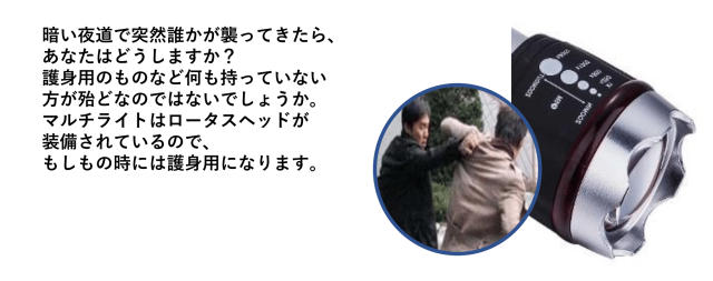 マルチライトは簡単にズーム機能が使え、遠くや足元も自在に照らせます。ストロボ機能、