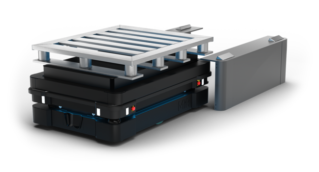 MiR パレットリフト1350は、MiR1350に装着するトップモジュールです。MiRパレットラック内のパレットを自律的にピックアップし、搬送することができます。