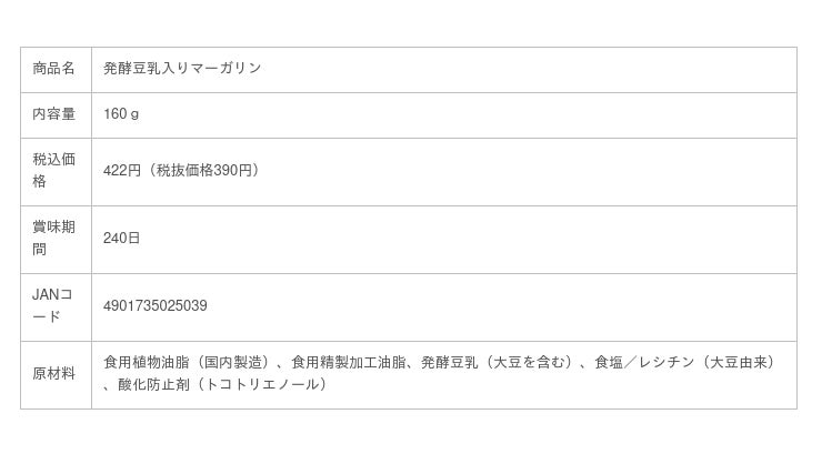 尚、近年問題視されたマーガリンに含まれる「トランス型脂肪酸」は、弊社では30数年前よりその低減に努めており、本品のトランス型脂肪酸含有量は、約0.03g/10gとバターよりも低い数値となっております。(バターに含まれるトランス型脂肪酸は0.19g/10g)
