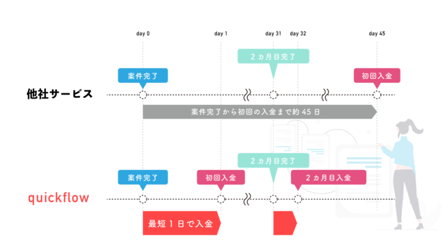 通常は締め日から45日程度の支払いサイトを最短1日に短縮することで、ファーム・SIerからの独立時の金銭面での安定やキャッシュフローの改善を支援します。
