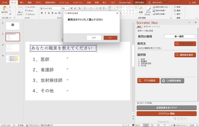 インターネット経由でのリアルタイム集計という複雑なシステムでありながら、設定は非常に簡単です。通常のパワーポイントファイルの作成にプラス数分程度の手間をかけるだけで、全ての設定が完了します。また実際の運用はパワーポイントのスライドショーを実行する感覚です。その設定は全てパワーポイント上から可能です(パワーポイントにアドインのアプリケーションがインストールされます)。