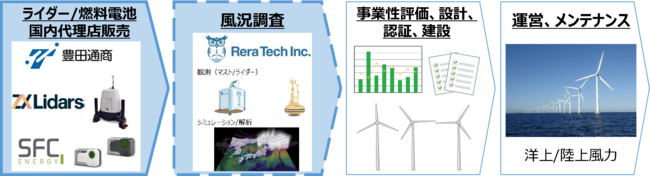 レラテックは洋上風力に係る高度な風況観測・シミュレーション・解析技術を有しており、創業時から風況調査およびそれに係るコンサルティングサービスを展開しています。また、豊田通商はドップラーライダー(風況観測機器)や同機器に使用する燃料電池の販売を行い、風力発電のための風況観測におけるプロバイダーとしてサービスを展開してきました。