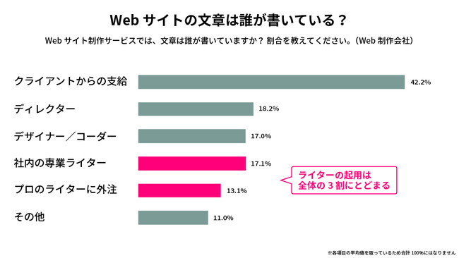 コンテンツ制作のなかでも、そのベースとなる文章がプロの手に委ねられているケースは稀です。Web制作会社のサービスでは、Webサイトの文章は「クライアントから支給」が最も多く42.2%(書き手の割合の平均値)。「社内の専業ライター(17.1%)」「プロのライターに外注(13.1%)」は合わせて30%程度にとどまりました。