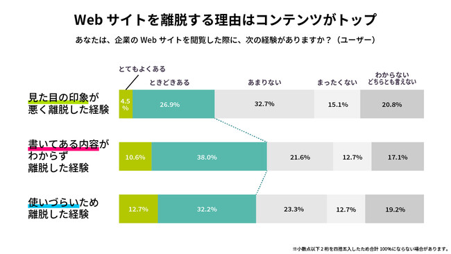 一般ユーザーにWebサイトを離脱した体験を聞いたところ、「見た目の印象が悪く離脱した経験」は「とてもよくある」が4.5%、「ときどきある」が26.9%(合計31.4%)。対して、「書いてある内容がわからず離脱した経験」は「とてもよくある」が10.6%、「ときどきある」が38.0%(合計48.6%)。コンテンツが原因と考えられる離脱は、半数近くが「経験あり」と回答しました。