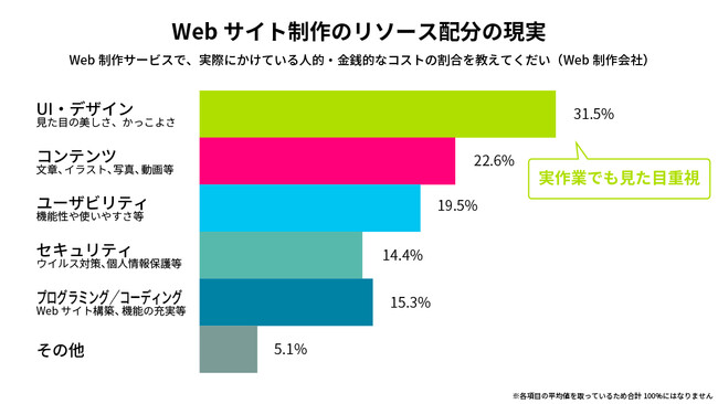 では、Web制作の現場では、リソースがどのように配分されているのか? 「UI・デザイン」「コンテンツ」「ユーザービリティ」「セキュリティ」「コーディング/プログラミング」「その他」の5項目で、Web制作会社に質問しました。ばらつきは見られましたが、平均では「UI・デザイン」が31.5%で最も多く、「コンテンツ」は10ポイント近く少ない22.6%にとどまりました。