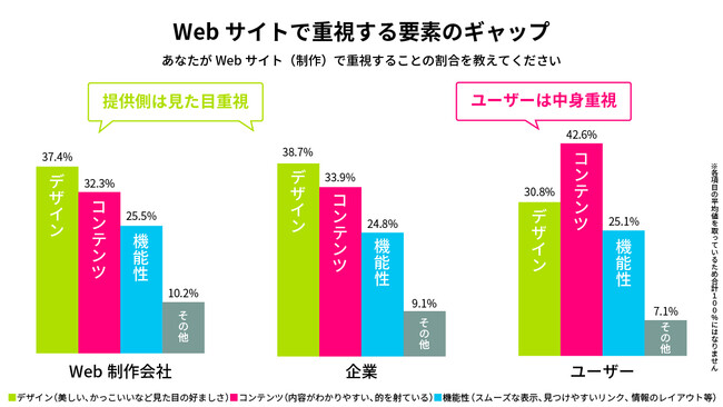 しかし、ユーザーが重視するのは「コンテンツ(中身)」が42.6%とトップで、2位の「デザイン(外見)」30.8%とは10ポイント以上の差が付きました。