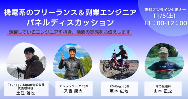 機電系を主軸とした、機械・電気・組み込み系の設計・開発におけるフリーランス・副業エンジニアのスキルと仕事をつなぐサービス「エンジニアプロモーション」を展開するTsunagu Japan株式会社(神奈川県横浜市旭区、代表取締役:土江 雅也)は、これからフリーランス・副業エンジニアを目指す方や、その活用を考える製造業の皆様に、その実態をお伝えする無料オンラインセミナー(パネルディスカッション)を2022年11月5日(土)11:00~に開催いたします。