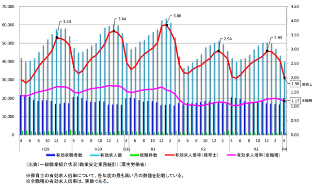 令和4年4月の保育⼠の有効求人倍率は1 .98倍であり、全職種平均の1.17倍を上回っており保育⼠の採用難が顕著です。