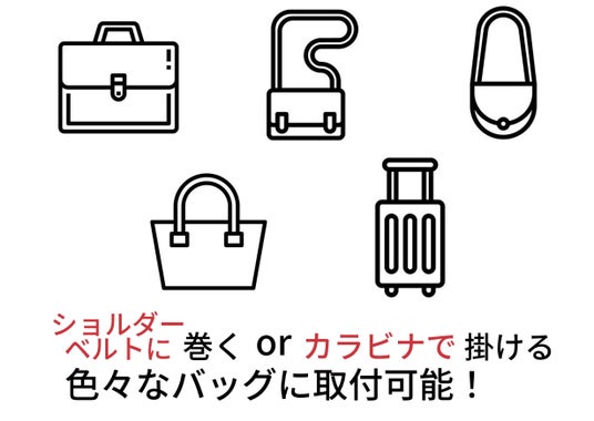 リュック以外にも、トートバッグ、ビジネスバッグなどさまざまなバッグ等に取付けが可能。