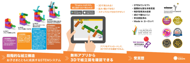 ヨーロッパのキプロスで生まれたENGINO(R)は、子どもたちの好奇心を引き出し、問題解決能力や新しいアイディアを創り出せるSTEAM人材を育成したいという想いが込められたSTEAMトイです。ENGINO(R)は2007年に発売され、欧州連合から開発資金を調達したことで、国際的なおもちゃメーカーや教育専門家から注目を集めました。一般的なブロックの形状でありながら、様々な方向からブロックをはめることができるENGINO(R)ブロックの特徴は、子どもたちの創造力を育む可能性を秘めています。発売以来、国内外の多くの賞を受賞し、今後、さらなるイノベーションを生み出すために、ENGINO(R)の開発が行われています。