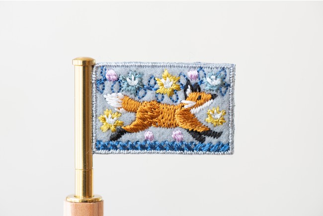 ピンと立った大きな耳とふさふさのしっぽを持つキツネが、緑あふれる大地を颯爽と走り抜けています。キツネの体は細かいパーツ毎に糸の方向を変えて光沢感を操ることで、今にもフラッグから飛び出してきそうな、躍動感あふれる姿を表現しています。手に取れば、そこに彼の動きから生まれる小さな風を感じることができそうです。