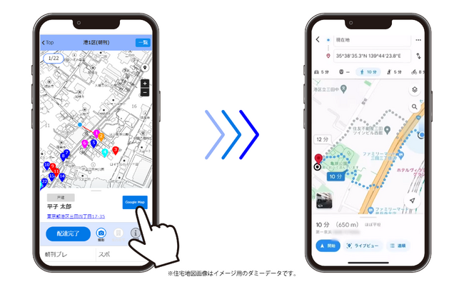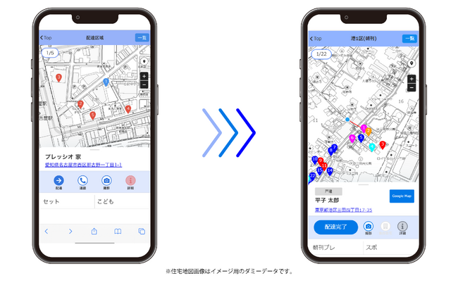「配達支援ツール」では、今まで配達先にマークがつくだけでしたが、新聞銘柄毎に色分けできるようになり、より見やすくなりました。