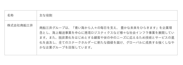 新たに参画した商船三井の有するこれまでの事業実績、技術、ネットワークとの相乗効果により、脱炭素社会を実現するための取り組みをますます加速していきます。