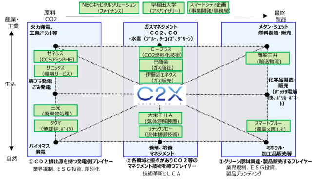 C2Xの推進には1.CO2排出源を持つ発電側プレイヤー、2.各領域と接点がありCO2等のマネジメント技術を持つプレイヤー、3.グリーン原料調達・製品販売するプレイヤーが必要で要素としては以下の8つの要素(機能、技術)があります。商船三井の参画により、連携企業は13社となり、C2Xプロジェクト推進体制が更に強化されます。