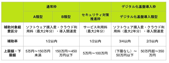 デジタル化基盤導入枠では、会計・受発注・決済・ECのうち1機能を満たした場合、50万円以下のクラウド利用料が2年分補助され、更に2機能以上を満たす事で最大350万円分が補助の対象となります。