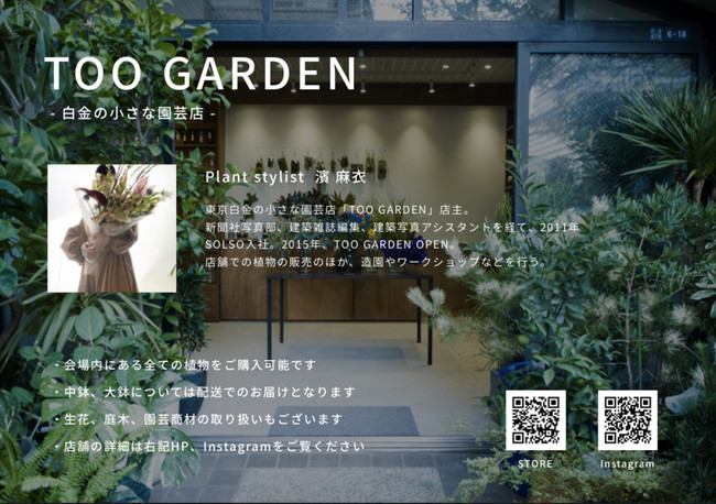 プラントスタイリスト濱麻衣さんが店主を務める白金の小さな園芸店「TOO GARDEN」とのコラボレーションで、観葉植物の販売を行います。