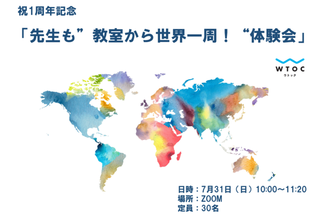 「教室から世界一周!」プロジェクトを運営する株式会社WTOC(ウトック/代表取締役:堂原有美、本社:東京都渋谷区)は、2022年6月15日で設立1周年。記念キャンペーン「先生も”教室から世界一周!”体験会」を開催します。