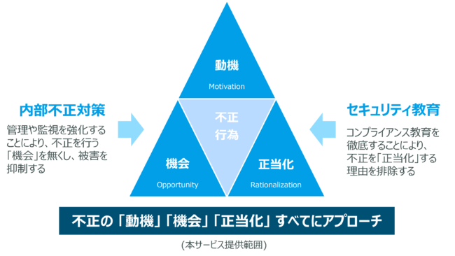 組織への内部不正対策を実施する前提として、不正は「動機」「機会」「正当化」の三要素が揃ったときに発生するといわれています。従来のセキュリティ製品は「機会」「正当化」のどちらか一方に働きかけるものが一般的ですが、JTPでは「動機」「機会」「正当化」すべての側面から対策を施し、不正が発生しうる隙を見逃さない点を強みとしています。