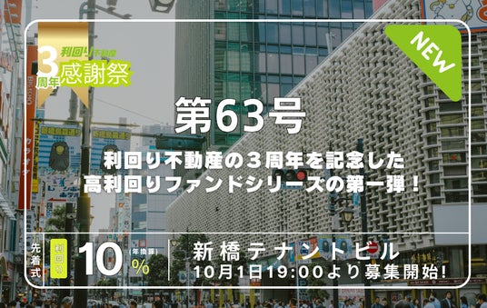 利回り不動産は3周年感謝祭第1弾として:新橋駅徒歩3分、予定利回り10%*のファンドを公開します。