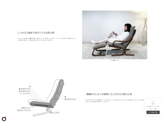 また、製品が生まれるまでの開発ヒストリーや、当社の家具を実際に購入して頂いたお客様の声を掲載しており、オンラインストアだからこそ知れる情報も多く掲載しております。