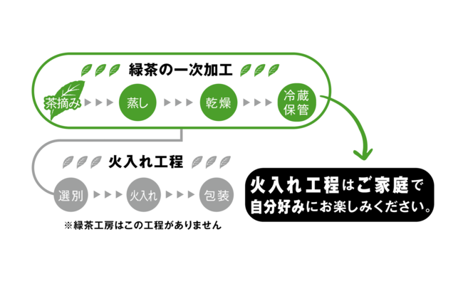 緑茶は火入れしたものが一般流通しております。今回一般には流通していない火入れ前の緑茶をお届けすることで最も鮮度が高く、香りが高い味わいを、産地でしか飲めない緑茶を、お家でみなさまに味わっていただきたいと思い仕組みを考えました。