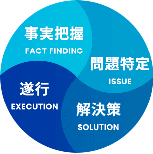 Fact finding(事実把握)、Issue(問題特定)、Solution(解決策)、Execution(遂行)の頭文字をとってFISE(ファイズ)サイクルと呼んでいます。
